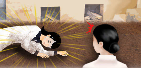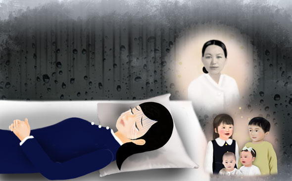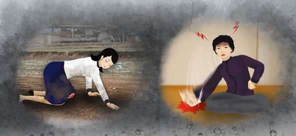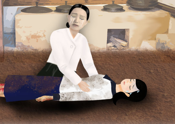 Ma mère a soigneusement essuyé mes mains et mes genoux qui suintaient de sang, puis elle m’a lavé le corps. Elle m'a habillé avec des vêtements propres et m'a soutenu en me conduisant dans la chambre. Lorsque je me suis allongée avec son aide, elle m'a parlé d'une voix tendre. "Ma chérie, ne t'inquiète pas du tout. Repose-toi tranquillement pendant un moment. Je m'occupe des enfants et des tâches ménagères." Puis elle a ajouté : "Dors un peu" puis elle a quitté la pièce.