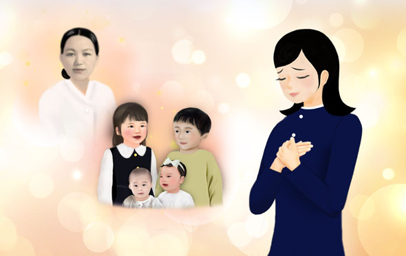 Par égard pour ma fille si angélique qui me réconfortait avec amour en étant à mes côtés, et par égard pour les enfants plus jeunes et ma mère, je ne pouvais envisager de mourir, pas même un instant. Je savais que si je mourais, mon mari pourrait se remarier et dans ce cas, les quatre enfants deviendraient comme des orphelins, laissés à la charge de ma mère. Cette pensée me poussait à me battre encore plus désespérément pour rester en vie. J'ai pratiqué le Semchigo comme si j'étais guérie et en bonne santé, nourrie par l'amour de mon mari, et j'ai continué à faire des efforts, les uns après les autres, dans l'espoir de retrouver mes forces et de vivre une fois de plus une vie heureuse.